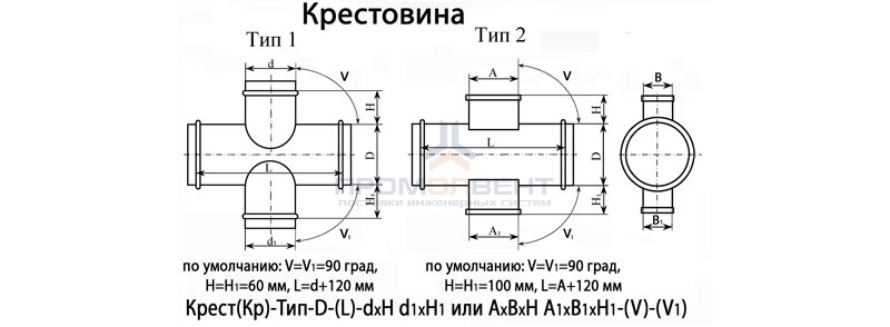 Крестовина представляет собой прямой участок воздуховода и врезанные в него врезки, количество врезок и сечение может быть различным. Крестовина круглого сечения может быть с прямоугольными врезками, с круглыми или в комбинации с прямоугольными и круглыми врезками. Врезки в крестовине могут быть расположены под различным углом.